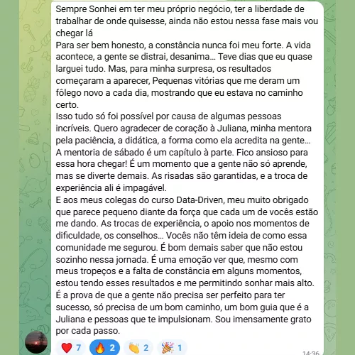Todo mês, o aluno mais engajado e aplicado — de acordo com as regras da comunidade — ganha uma hora de mentoria individual comigo. Uma oportunidade única para revisar suas campanhas, corrigir erros e criar um plano de ação personalizado para escalar suas vendas.